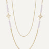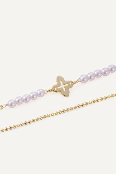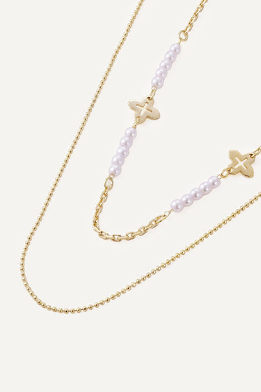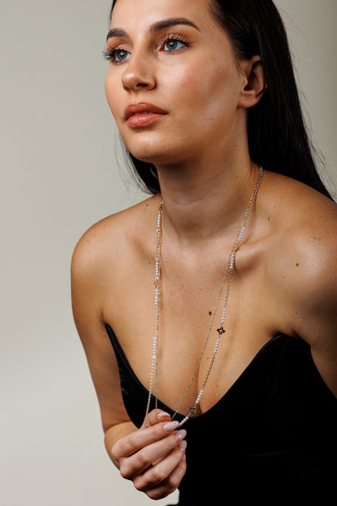 Colier lung placat cu Aur 18K, în două straturi, cu segmente din mărgele perlate și elemente tip trifoi. Siluetă alungită care subliniază decolteul, se poate purta și dublat pentru efect de layering. Versatil pentru casual și elegant.
